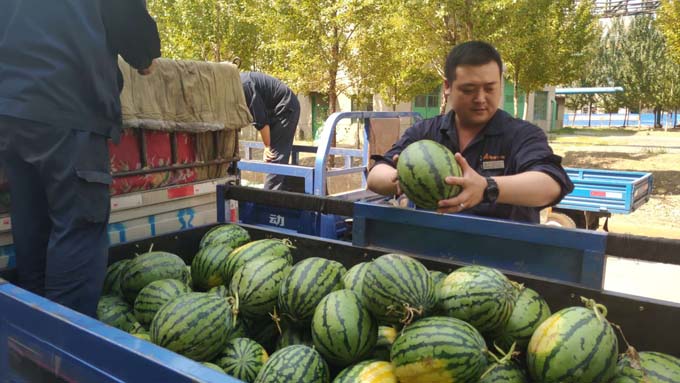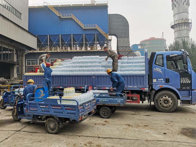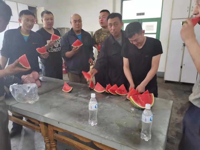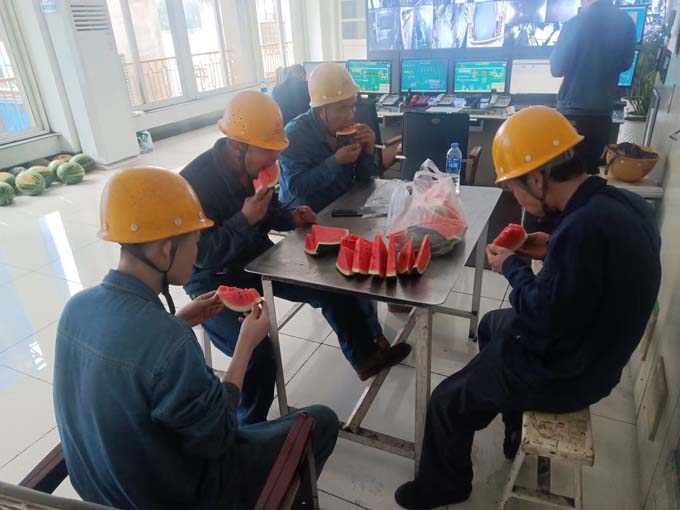 廠房里,公司工會為奮戰(zhàn)在一線的職工發(fā)放清涼解署的鹽汽氣和西瓜,給大家送去一份夏日的清涼。工會主席叮囑職工要注意生產安全,合理安排作息時間,做好防暑降溫工作。